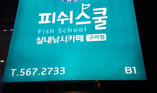 구리피쉬스쿨 실내낚시카페 주소 : 경기도 구리시 안곡로49 안곡로49 용덕빌딩 지하1층 전화번호 : 031-567-2733 영업시간 : 평일 15:00 – 01:00 주말 12:00 – 02:00